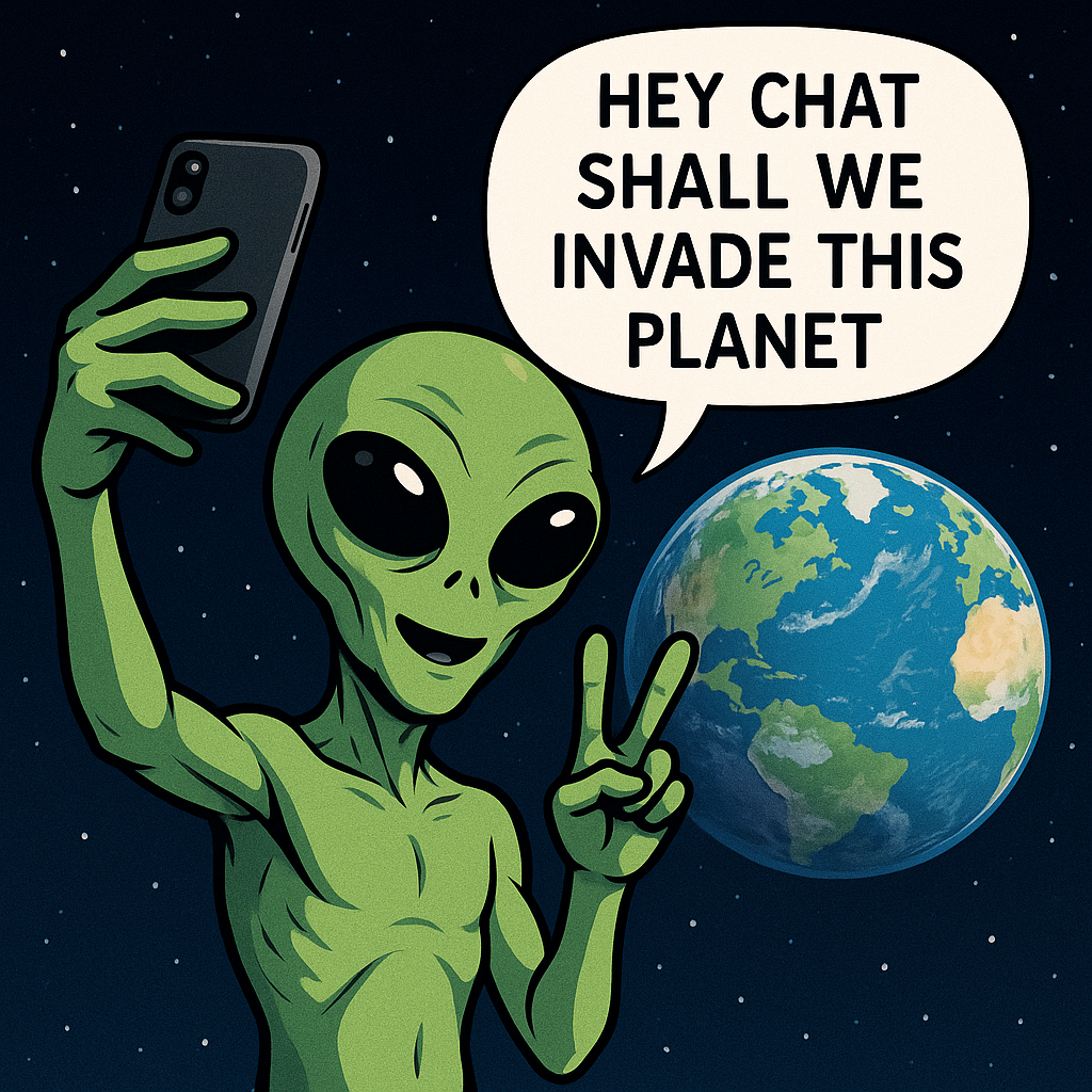 cartoon-style image of an alien taking a selfie with Earth in the background.