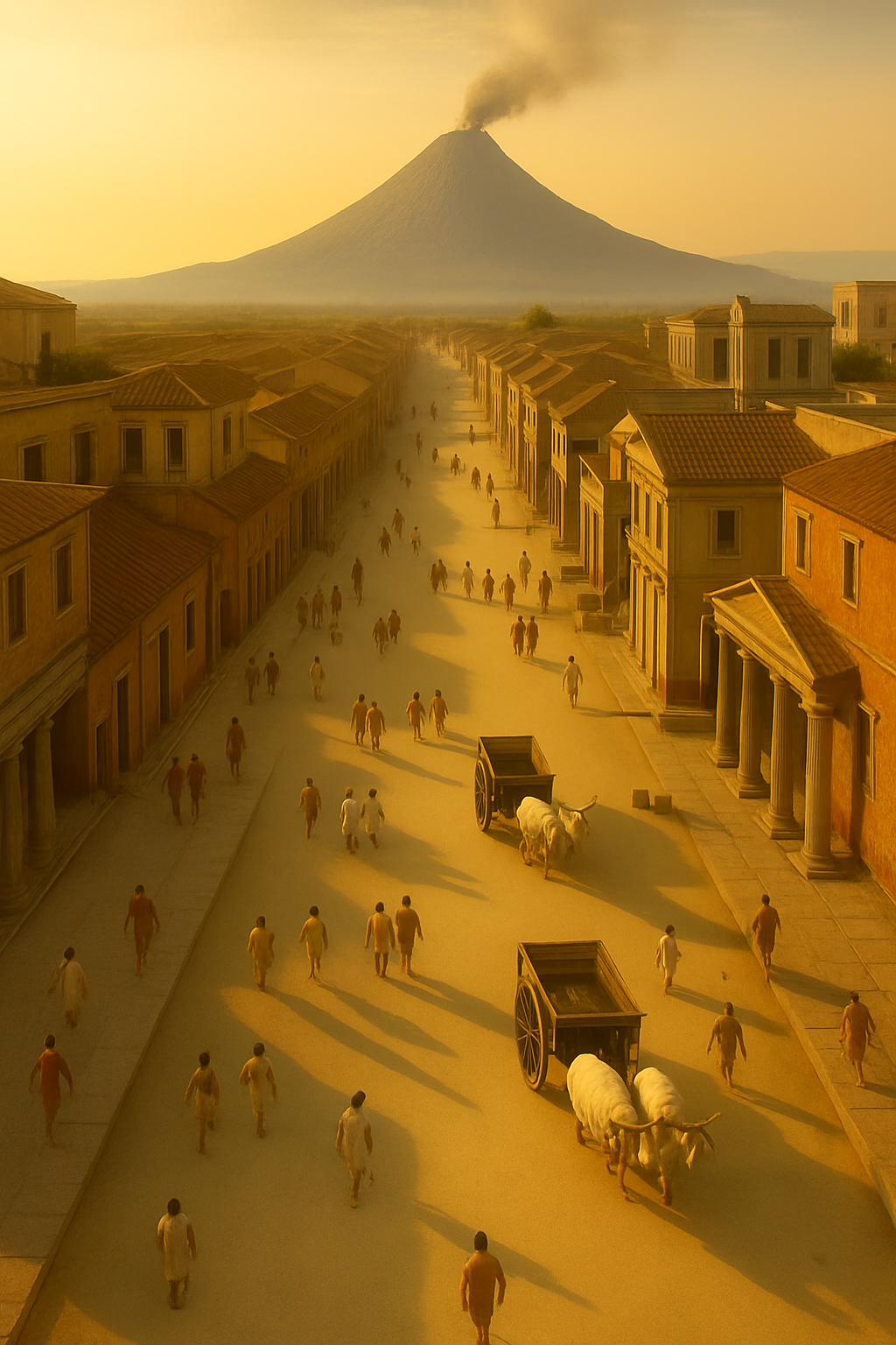 a bustling ancient Roman city at sunset, with golden light bathing the scene. A wide central street, lined with classical buildings featuring columns and tiled roofs, stretches toward the horizon. Citizens dressed in traditional Roman tunics walk along the street, some in groups, while others push carts or lead oxen-drawn wagons.